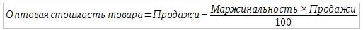 Оптовая стоимость товара =Сумма продаж – ( (маржинальность%*сумма продаж)/ 100)