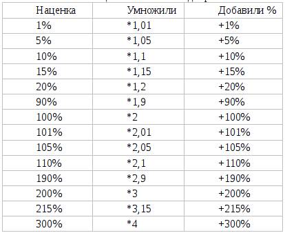 Для того чтобы установить цену по наценке вы будете или умножать или прибавлять. Умножать коэффициент, прибавлять процент. В таблице показано соответствие способов.