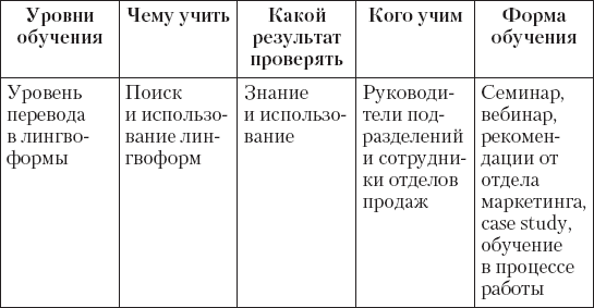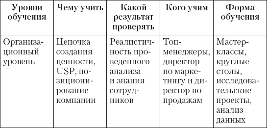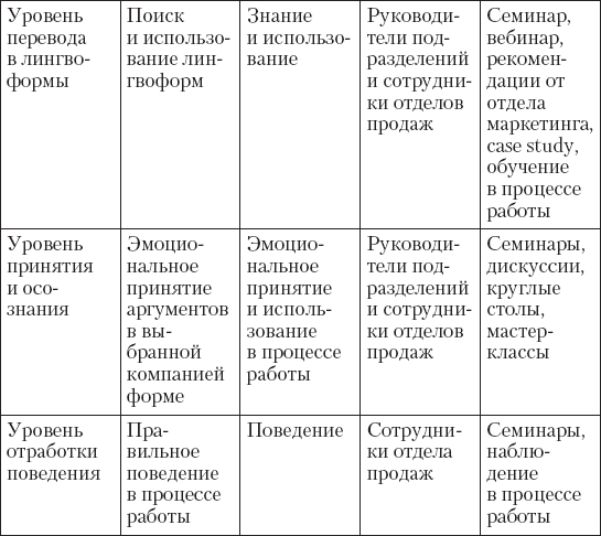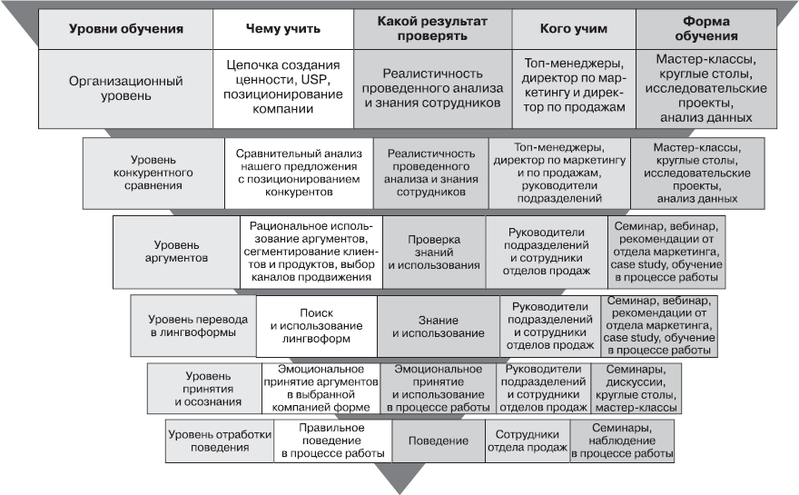 Эта пирамида развития создавалась с учетом системного взгляда на подготовку сотрудников отделов продаж. В ней описан процесс выбора и оттачивания аргументов, сегментирования клиентов, подготовки к переговорам и отработки поведения. Это прикладная часть обучения. В первую очередь отрабатывается содержательная часть – что говорим и кому. И в значительно меньшей степени – как мы говорим. Вопросы коммуникации и психологических аспектов переговоров не затрагиваются (оставим эту тему другим многочисленным авторам).