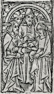 Затем священнослужители Храма обратились к Господу с вопросом, как им поступить с Марией, потому что срок пребывания ее в Храме закончился, и она достигла совершеннолетия. И Ангел Господень сообщил первосвященнику Захарии, чтобы он собрал вдовцов Израиля и выбрал из них мужа Марии. Всем вдовцам первосвященник раздал посохи, и только из посоха Иосифа вылетела голубка, определив таким образом, кому стать мужем Марии.