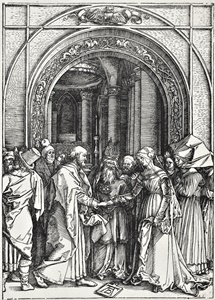 Так Иосиф, который был намного старше Марии и имел детей от предыдущего брака, стал мужем Марии. Когда он уехал заниматься плотницким ремеслом, Мария, наряду с другими чистыми девами Израиля, была вызвана в Храм, и ей поручили вышивать пурпуром.