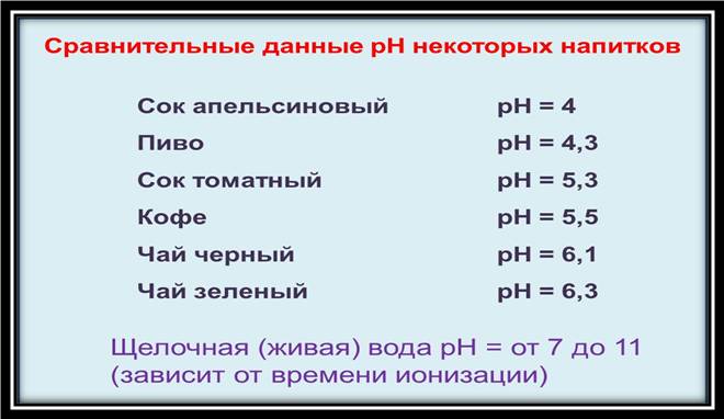 Большинство жидкости, употребляемой человеком ежедневно, имеет кислотный рН. Кровь человека с рН = 7, 35 – 7, 45. Для человека весьма важно употреблять воду со щелочным рН – «живую воду» ( – заряд).