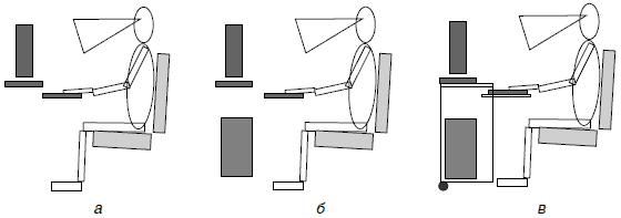На рисунке видно, что поверхность для установки клавиатуры должна находиться ниже, чем поверхность для установки монитора, поэтому для клавиатуры можно сделать полку, задвигаемую под основную столешницу. Таким образом решается задача минимальной глубины стола в нерабочем положении. Системный блок в таком случае удобно спрятать под стол и расположить вдоль – левая стенка будет обращена вперед, как и требовалось, а лицевая панель обращена вправо, что тоже достаточно удобно (рис. 1.5, б).