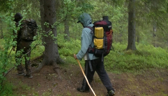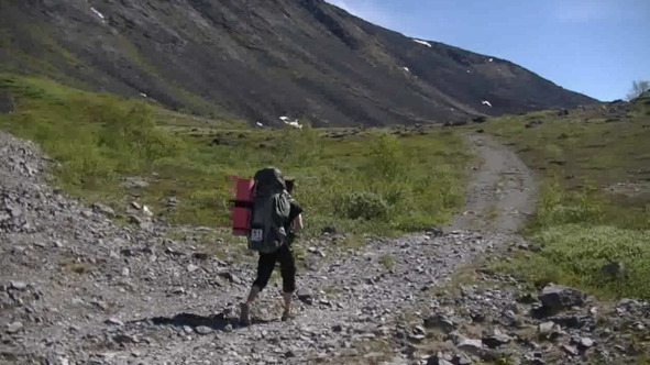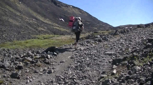 Заблудиться у нас не получилось. «Нимфа» объяснила, что надо держаться голубых ленточек на деревьях. Так и поступали. И другим подсказывали. Семейную группу из Москвы, идущую вкруговую из Ловозера, вывели к ленточкам. Жалко их стало… особенно собаку. Бедное животное! Ее тоже нагрузили, причем двумя рюкзаками по бокам. Садисты! Вот бы тут вмешаться защитникам животных.