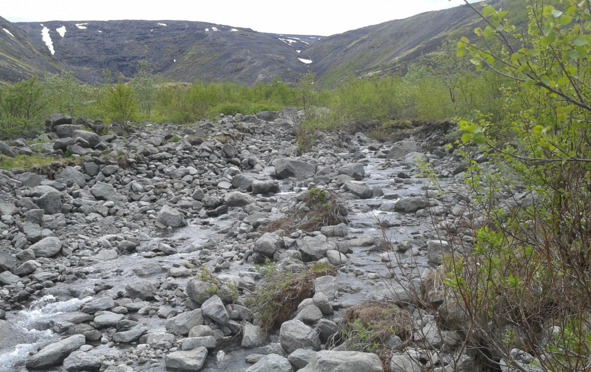 Вот и подножие. Речка течет, Эльморайок. Вернее, только начинает течь.