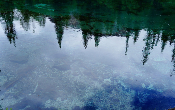 Бросили по совету «нимфы» монетки, стараясь попасть в жерло родника – темный провал на дне. Жутковато!