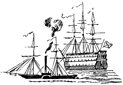 Грохнула пушка. Веня протер глаза и увидел, что это с Павловской батареи. Кольцо пушечного дыма убегало с батареи в море по-над волнами навстречу какому-то пароходу; кольцо растрепалось и полетело пушинкой по ветру назад. Веня сразу узнал, что пароход чужой – у нас на флоте нет такого фрегата[24] – длинный, трехмачтовый, двухтрубный, винтовой. Под всеми парусами и под парами чужой фрегат весело бежит, чуть вея из белых труб дымком. За кормой стелется белый шлейф пены. Пушка не остановила парохода. Он идет, не меняя курса, прямо ко входу в бухту…