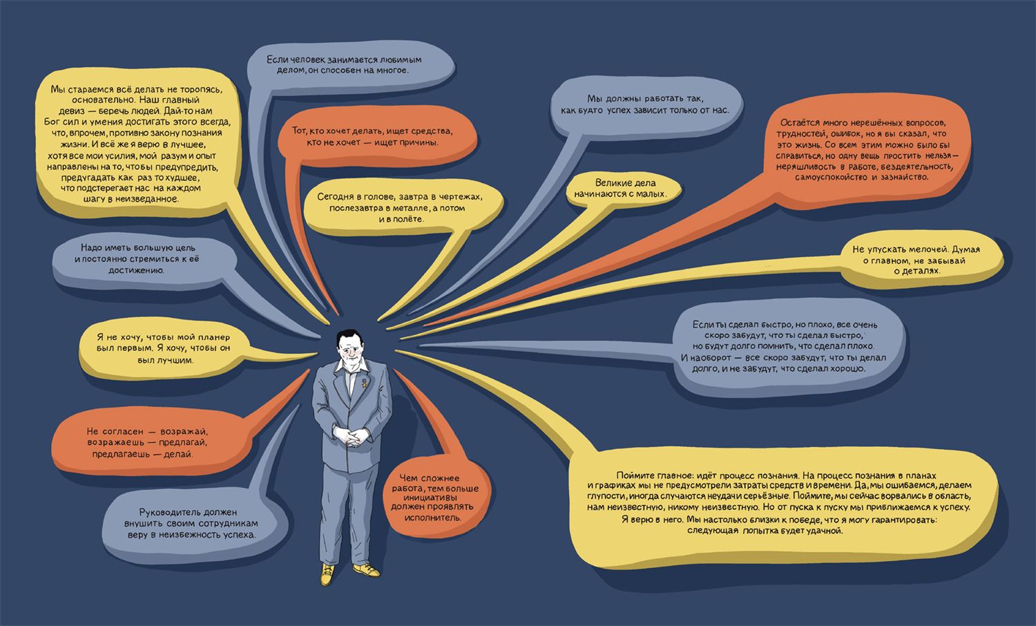 Королёв – выдающийся руководитель. Он умел быть строгим, но справедливым, брал на себя ответственность и рисковал. Его можно назвать настоящим человеком дела, работавшим с утра до поздней ночи ради великой цели. Он заботился о каждом своём сотруднике.