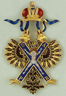 На знаке ордена Андрея Первозванного изображен сам распятый святой. На концах креста золотые буквы: SAPR (Sanctus Andreas Patronus Russiae – «Святой Андрей Покровитель России»). Выше – двуглавый российский орел, увенчанный тремя коронами. На оборотной стороне знака, на груди орла, начертан девиз ордена: «За Веру и Верность». В старину орден носили на голубой шелковой ленте. Великие князья получали его при крещении. Отсюда пошел современный обычай перевязывать младенцев мужского пола лентой голубого цвета.