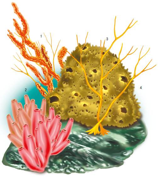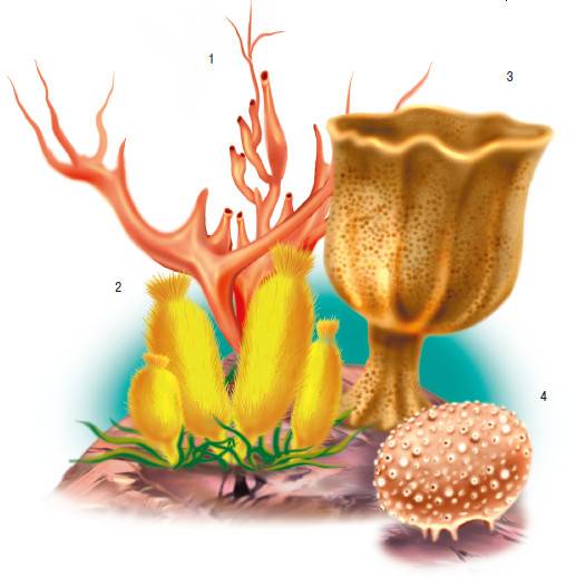 Губки: 1 – аксинелла, 2 – галиклона, 3 – распайлия, 4 – клиона