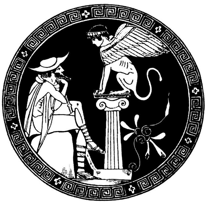 Миф о царе Эдипе повествует о том, как Чудовище Сфинкс с лицом женщины, телом льва и крыльями птицы было наслано богами на город Фивы в наказание за грехи царя Лая. Поселившись на горе близ Фив, Сфинкс задавала каждому проходившему мимо загадку: «Кто утром ходит на четырех ногах, днем на двух, а вечером на трех?».