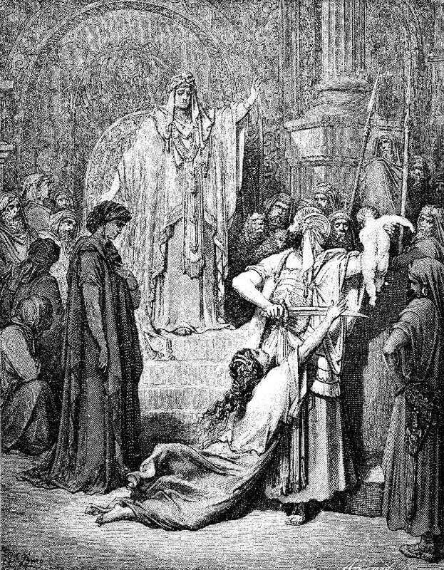 Пришли к царю Соломону две женщины, и молвила одна из них: «Разреши наш спор, владыка! У меня есть ребенок, но эта женщина говорит, что это не мой ребенок, а ее». Вторая женщина закричала: «Это так!». Выслушав женщин, царь Соломон приказал воину, стоявшему рядом: «Возьми меч и рассеки ребенка надвое. И вручи одну половину одной женщине, а другую половину – другой». «Не делай этого! – бросилась вперед первая женщина. – Лучше отдай мое дитя ей». Вторая же женщина сказала: «Справедливо твое решение, о мудрейший. Пусть он умрет и не достанется никому, чем останется у нее». Тут Соломон удержал руку воина и сказал: «Отдайте ребенка той женщине, которая пожалела его: она и есть его мать».