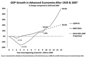 Рис. 1. ВВП развитых экономик, % прироста к уровням 1929 г. и 2007 г.