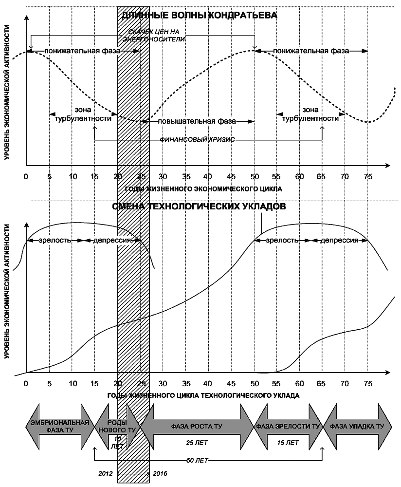 В долгосрочном развитии экономики передовых стран выделяются этапы подъема экономики на основе фазы роста доминирующего технологического уклада (примерно четверть века) и этапы ее структурной перестройки при смене технологических укладов (около полутора десятилетия), сопровождающиеся депрессиями, кризисами, финансовой турбулентностью, высокой неопределенностью и политической напряженностью.