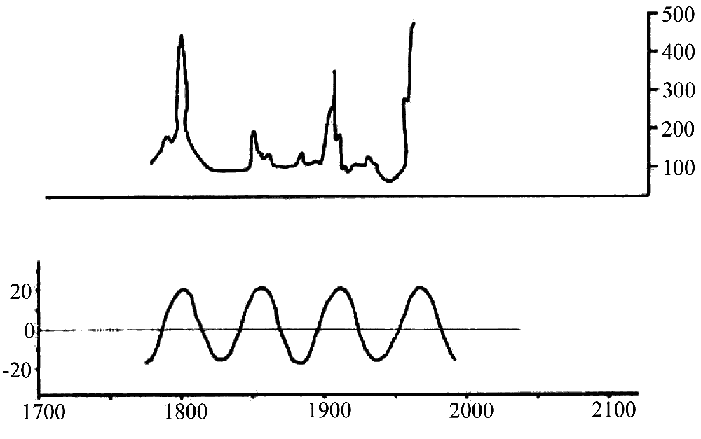 На Рис. 2 приведен опубликованный почти 40 лет назад график, совмещающий колебания цен на энергоносители с отклонениями от тренда повышения мирового потребления энергии. Мы его не стали актуализировать, чтобы не подвергнуться подозрениям в подтасовке данных в связи с произошедшим в нулевые годы этого столетия всплеском нефтяных цен. Опираясь на отраженную на этом графике закономерность, мы сделали своевременный прогноз о неизбежности падения цен на нефть сразу же после их резкого подъема.