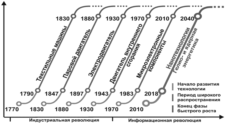Рис. 4. Смена технологических укладов в ходе современного экономического развития с указанием их ключевых технологий преобразования энергии в работу