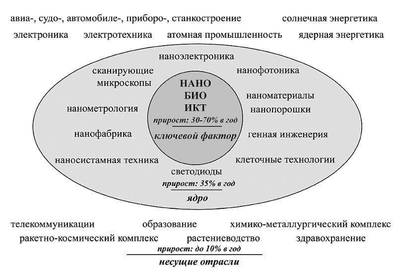 Ведущие страны мира успешно осваивают комплекс нано-, биоинженерных и аддитивных технологий, которые, наряду с информационно-коммуникационными, составляют ключевой фактор роста нового технологического уклада. Его «ядро» расширяется с темпом около 35 % в год, формируя технологические траектории новой «длинной волны» экономического роста[13] (Рис. 5).