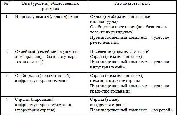 Из таблицы видно, что любой объект нижележащего вида (уровня) общественных резервов создается коллективом из сообщества людей, находящегося на вышележащем уровне общественных резервов, то есть на уровне большей размерности. Так личной вещью человека (например, ложкой) его обеспечивает семья. Кто-то из членов семьи путем личного действия по её изготовлению или приобретению. Кто-то – кому вся семья создает условия1 для выполнения этой задачи. А вот скажем такое имущество как дом для семьи, обеспечивается уже не одной семьей, а всем сообществом людей, составляющих общину поселения. Для чего уже в общине поселения люди создают для этого действия соответствующие условия, выделяют соответствующие ресурсы и возможности. И такое правило действует для всех видов (уровней) общественных резервов. Само собой, никто не может и не вправе запретить человеку сделать для самого себя любой имущественный объект. Задача сообщества любого уровня при этом – создать условия человеку для такой продуктивной деятельности и проконтролировать применения созданного объекта.