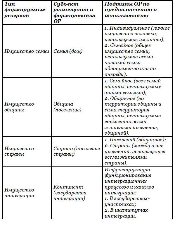 «Институционально, общественные резервы – это четыре типа имущества – семейное, поселений, страны, человечества (в случае Евразийской интеграции – имущество континента Евразия или стран ЕАИ), причем каждый тип имущества состоит из двух подтипов.