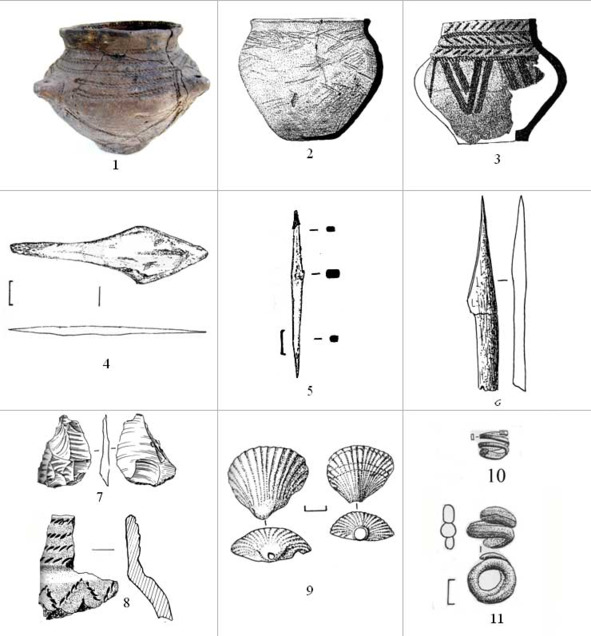 Ceramics is represented by cans, pot-like and jagged vessels with geometric patterns in the form of horizontal and inclined lines, flutes, zigzags, Christmas trees and other geometric shapes.Sometimes on vessels, mainly in their upper part, string ornament and various signs in the form of crosses, solar signs, rectangles, schematic anthropomorphic and zoomorphic images are found. Already at a later time, a swastika and meander pattern begins to be depicted. A number of researchers see them as primitive pictographic writing. The content of these signs has not yet been deciphered. In burials there is also wooden cult ware, sometimes with bronze shackles. Tools and weapons made of stone are represented by a variety of axes and maces, scrapers, hammers, knives, anvils, ore graters and abrasives. Bone products are widespread: psalms, awls, veneers, punctures, needles, knitting needles, arrowheads. Metal tools are represented by axes, sickles, telescopes and chisels, punctures, needles, cuttings knives with highlighted crosshairs and daggers with an annular emphasis.