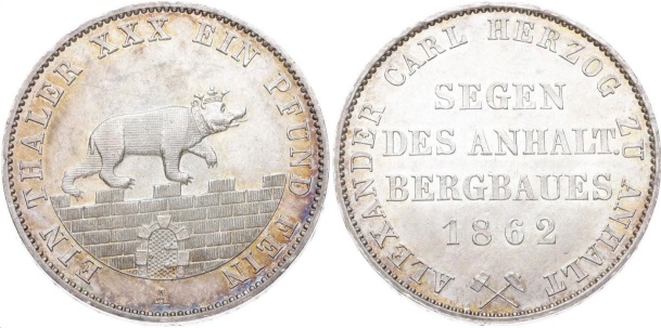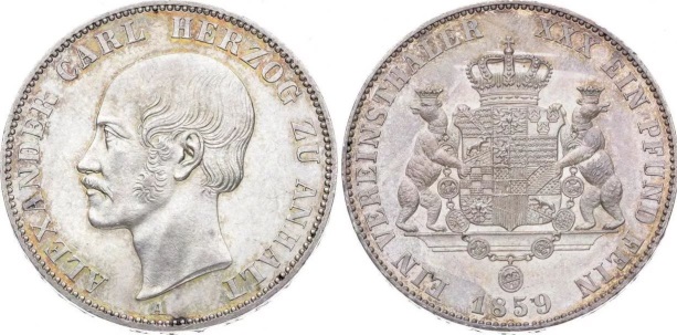 Герцогство Анхальт-Бернбург представлено двумя монетами, отчеканенными в период правления герцога Александра Карла (1834-1863 г.г.).