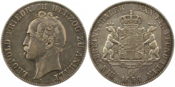 Легенда реверса: HERZOGTHUM ANHALT * GETHEILT 1603 VEREINT 1863 * (Герцогство Ангальт, разъединено в 1603, воссоединено в 1863) EIN THALER 30 EIN PF.F.