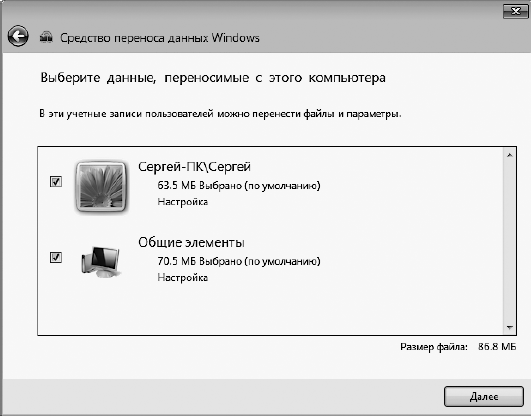 После выбора способа, например Внешний диск или USD-устройство флэш-памяти, будет запущено сканирование данных, доступных для переноса. По завершении этого процесса в новом окне отобразится информация об объеме, который займет перемещяемая информация для каждой учетной записи. Здесь также можно выбрать, какие данные не следует переносить. Для этого воспользуйтесь командой Настройка (рис. 1.13).