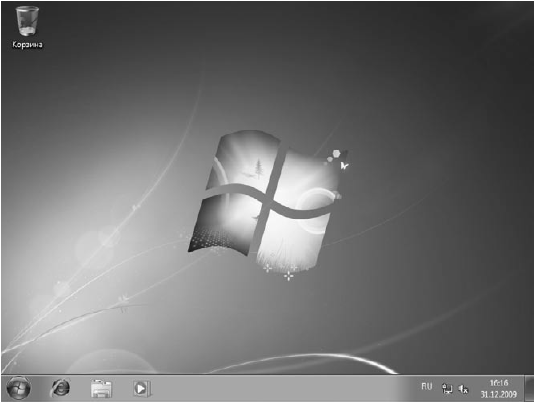 После того как произойдет загрузка операционной системы, на экране появится Рабочий стол и Панель задач с находящейся на ней кнопкой Пуск и областью уведомлений. При первом запуске Windows 7 на Рабочем столе можно видеть только один значок – Корзина. По мере работы на компьютере пользователь сам помещает значки на Рабочий стол, они также могут добавляться автоматически при установке программ (рис. 2.1).