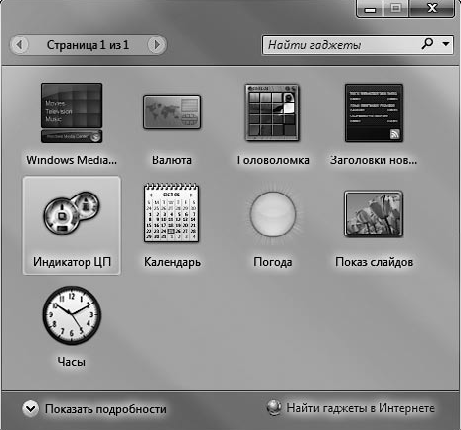 В составе Windows 7 имеется 9 таких мини-приложений. Чтобы добавить любое из них на Рабочий стол, необходимо щелкнуть правой кнопкой мыши на любом свободном участке Рабочего стола и выбрать в появившемся меню команду Гаджеты. Откроется окно со списком имеющихся мини-приложений (рис. 2.10). Просто перетащите понравившуюся мини-программу из этого окна на Рабочий стол или дважды щелкните на необходимом гаджете. В результате он автоматически разместится на Рабочем столе.