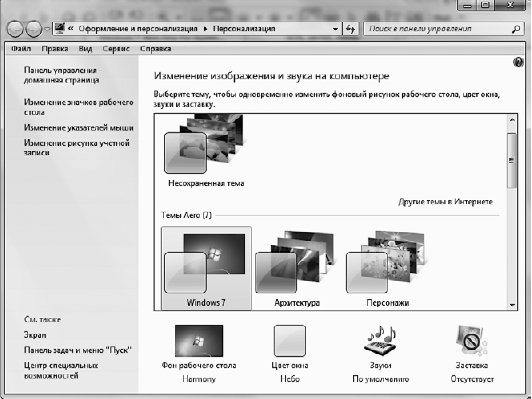 Каждая тема объединяет в себе параметры фона Рабочего стола, цвета окна, звуковую схему и заставку. Все они отображаются в нижней части окна Персонализация в виде соответствующих значков. Для изменения любого из них щелкните на значке и задайте нужные настройки. Далее рассмотрим элементы тем оформления подробнее.