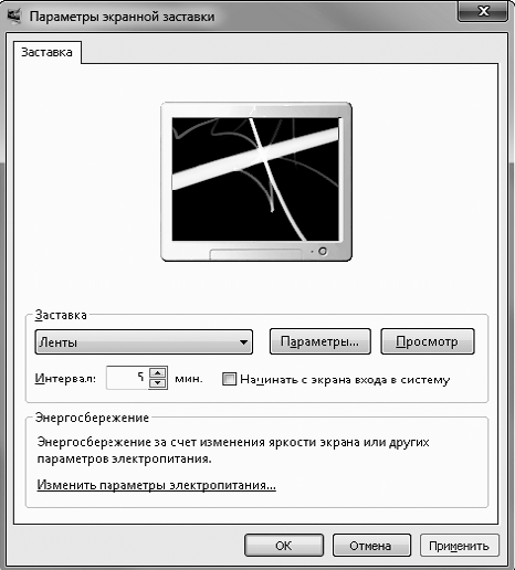Чтобы сменить заставку, выберите нужную из раскрывающегося списка. Для некоторых заставок можно изменять настройки (например, задать надпись, тип ее вращения, выбрать папку с изображениями, скорость смены рисунка) в окне, открываемом кнопкой Параметры. Чтобы увидеть выбранную заставку в действии, нажмите кнопку Просмотр. Демонстрация заставки прекращается сразу после того, как вы подвигаете мышь или нажмете любую клавишу. Промежуток времени, по прошествии которого будет включаться показ заставки, можно установить в числовом поле Интервал.