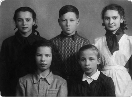 Сергей в школе и со своими одноклассницами. С Таней Кореньковой – Додух (стоит слева) Сергей дружил всю жизнь.