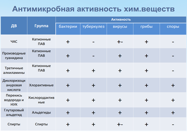 1. ЧАС (четвертичные аммониевые соединения) – имеют ограниченный спектр действия (бактерии, отдельные вирусы). Низкая активность в кислой среде и при повышенной минерализации воды.