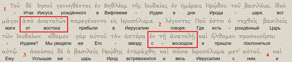 Первая мысль, которая может прийти в голову по прочтении первого стиха, указывает на возможное толкование фразы, переведённой как «от востока», в качестве указания на то, что это были посланцы Востока (то есть Бога), и тогда нет проблем с тем, что они могли идти на восток в смысле географического направления. Но эта версия кажется слишком натянутой. Тогда есть и другой вариант, который выглядит куда более логичным и правильным. Греческие слова «анатолОн» (в 1-м стихе) и «анатолИ» (во 2-м стихе) могут быть переведены не только как «восток» в географическом смысле, но и в смысле времени суток, а именно как «восход», что мы и видим во 2-м стихе. То есть, возможно, что волхвы, двигаясь с востока, однажды на восходе солнца (то есть утром, на истоке) вдруг увидели на небе искомую звезду, и их слова вовсе не означали, что они увидели её на востоке в географическом смысле.