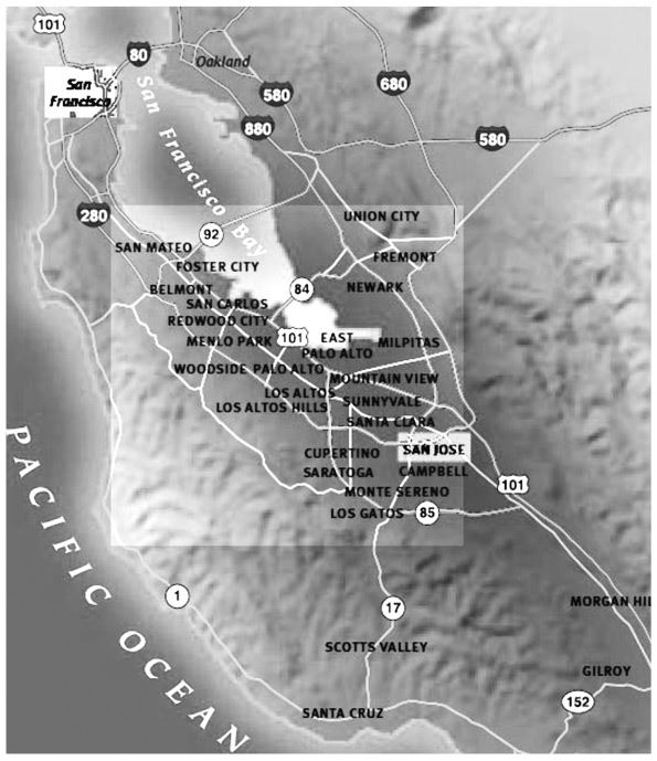 Врезается в сушу теплый Сан-Францисский залив, на берегах поднимаются невысокие горы, больше похожие на пологие холмы. В конце 1950-х годов значительные площади этих берегов были заняты садами – там выращивали абрикосы и сливы. Эпитет «кремниевая» появился в связи с развитием тут производства полупроводников на базе кремния в начале 1980-х. Сейчас Кремниевая долина занимает в американской мифологии такое же место, как «Макдоналдс» в области кулинарии, а Бэтмен – в игровой системе борьбы добра со злом.