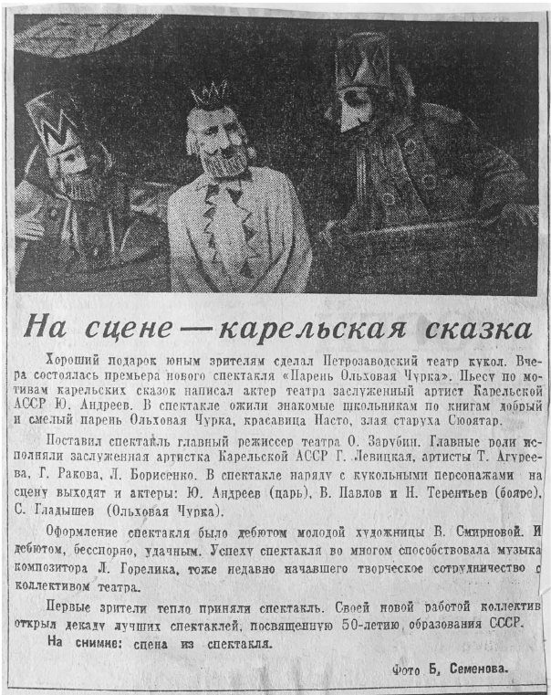 Через полгода – 12-го декабря петрозаводский зритель увидел постановку «Парень Ольховая Чурка» по мотивам карельских сказок. Пьесу написал актёр театра, талантливый Юрий Иванович Андреев. Он же играл в этом спектакле роль царя.