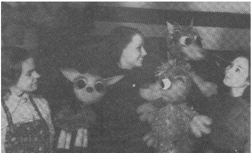 В. Смирнова с коллегами З. Сахно и Л. Лубениной с куклами из спектакля «Странный Вовка». Уфа, 1970-е гг.