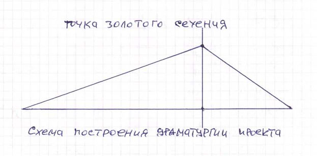 Схема построения драматургии проекта: вступление (увертюра или пролог) → экспозиция → разработка → реприза → кода. На грани 2/3 длительности звучания всего произведения обязательна кульминация – точка золотого сечения, а далее в течение оставшейся 1/3 длительности опуса происходит отпуск (разрядка и кода).