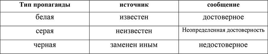 Для потребителя информации имеет значение не только сама информация, но и её источник. На типологии источников строится традиционное деление пропаганды на белую, серую и черную: