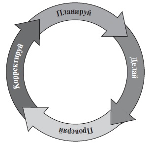 Он учил управлению технологическим процессом с помощью контрольных карт, пропагандировал концепцию цикла PDCA, предложенную Шухартом, известную сегодня во всем мире под названием «Цикл Деминга». Он ввел модификацию цикла – цикл PDSA (study – изучать). Этот цикл обычно изображают в виде круга, что символизирует принцип повторяемости – совершенствование с использованием знаний, накопленных на предшествующей стадии (рис. 1).