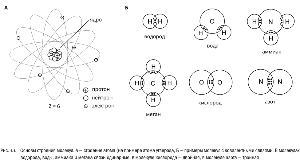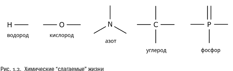 Итак, валентность водорода равна 1, кислорода – 2, азота – 3, углерода – 4 и фосфора – 5. Эти числа надо просто запомнить. Иногда у некоторых из перечисленных элементов бывают и другие валентности, но, занимаясь биологией, это можно игнорировать во всех случаях, кроме немногих особо оговоренных. Одновалентный водород, двухвалентный кислород, трехвалентный азот, четырехвалентный углерод и пятивалентный фосфор – главные химические слагаемые жизни (см. рис. 1.2).