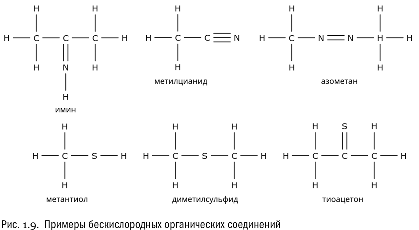 Однако ниоткуда не следует, что эта возможность – единственная. В состав органических молекул вполне могут входить и многие другие элементы помимо кислорода – например, азот и сера. С азотом мы уже знакомы, а о сере (S) сейчас достаточно сказать, что ее валентность в органических веществах чаще всего равна двум – как у кислорода. А теперь назовем навскидку несколько классов органических соединений, в которых есть азот или сера, зато никакого кислорода нет (см. рис. 1.9):