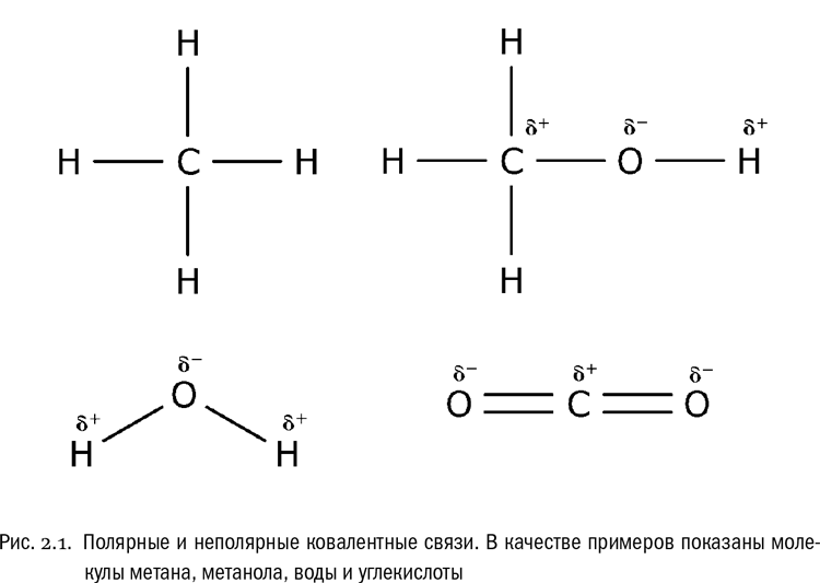 Если же ковалентную связь образуют два разных атома, то общие электроны смещаются к тому из них, у которого электроотрицательность выше. Такая связь называется полярной (см. рис. 2.1, 2.2А). При очень большой разнице в электроотрицательности связь может даже превратиться в ионную – это случится, если один атом полностью “отберет” общую пару электронов у другого. В молекулах, из которых состоят живые существа, ионные связи встречаются относительно редко, зато ковалентные полярные – очень часто. Например, это широко распространенные в органических веществах связи C – O и H – O (см. главу 1).