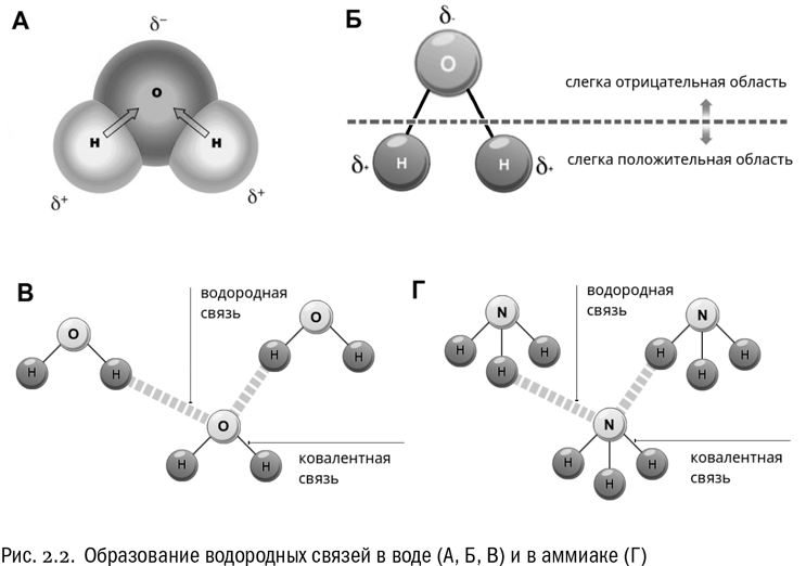 Связь между водородом и кислородом в молекуле воды – это типичная ковалентная полярная связь. Электроотрицательность кислорода намного выше, поэтому общие электроны смещены к нему. В результате на атоме кислорода образуется маленький отрицательный заряд, а на атомах водорода – маленькие положительные заряды. На графических формулах эти маленькие заряды, величина которых значительно меньше единицы, принято обозначать буквой δ (“дельта”) с добавлением соответствующего знака. Как мы теперь знаем, связи кислорода с водородом или углеродом вообще всегда полярные. Молекулы, в которых много таких связей, несут многочисленные частичные заряды, отрицательные на кислороде и положительные на водороде или углероде (см. рис. 2.1, 2.2Б).