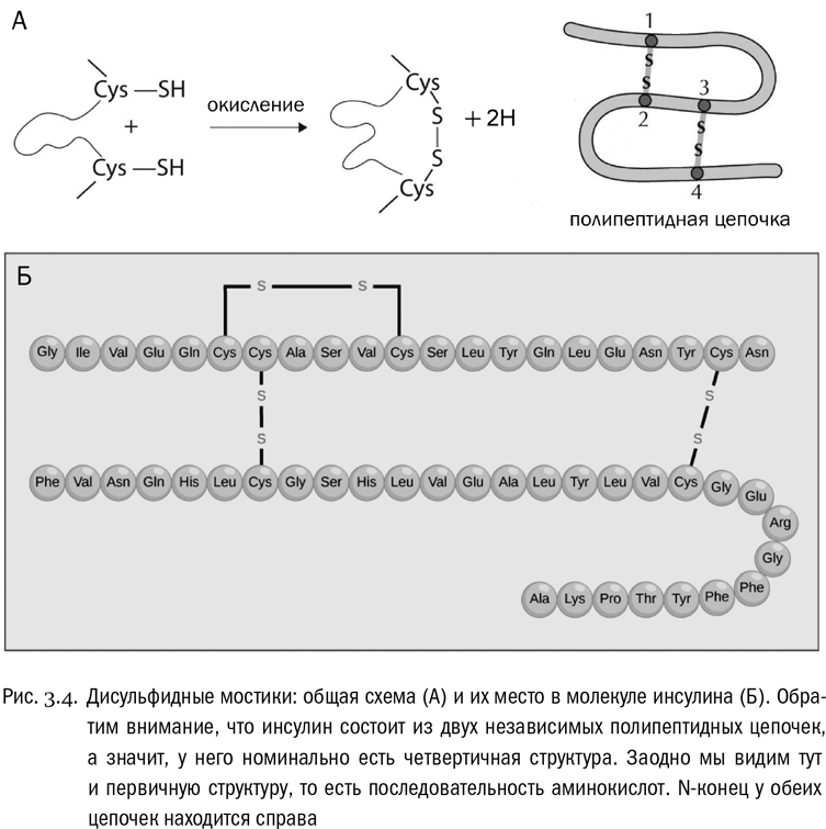 Есть и четвертый тип взаимодействий. Он зависит от единственной аминокислоты, радикалы которой могут образовать между собой аж ковалентные связи (не имеющие никакого отношения к пептидным). Эта аминокислота – цистеин. В радикале цистеина есть сульфгидрильная группа – SH, аналогичная спиртовой группе (–OH), но с атомом серы вместо атома кислорода. Целиком радикал цистеина имеет вид – CH2–SH. Так вот, уже в готовом белке может произойти реакция, при которой у двух таких радикалов будет отобран водород (его унесут специальные молекулы-переносчики), а свободные валентности атомов серы замкнутся друг на друга и образуют между остатками цистеина связь – S – S–. Это называется дисульфидным мостиком (см. рис. 3.4А). Белок вполне может быть в нескольких местах “сшит” такими мостиками (см. рис. 3.4Б). Причем реакция их образования обратима: дисульфидные мостики могут возникать и рваться, и это бывает важно для регуляции некоторых физиологических процессов.