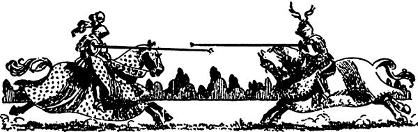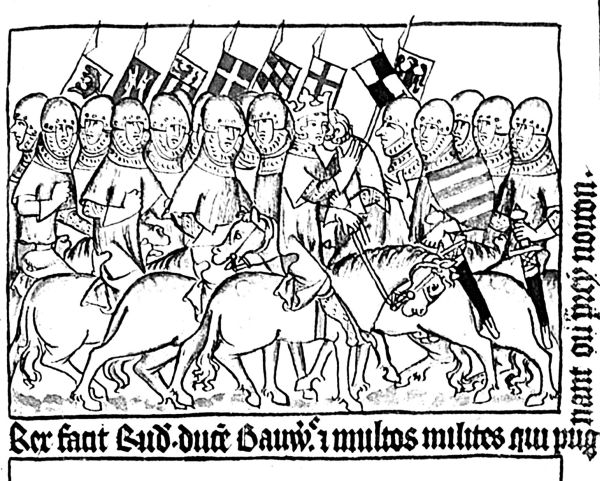 Конные рыцари со своими знаменами на параде в честь открытия турнира. Миниатюра из турнирной книги «Триумф императора Максимилиана I» 1515 г. Ганса Бургкмайра Старшего (1473–1531). Показаны рыцари в типичном для Германии начала XVI в. тяжелом вооружении. Рыцари и их боевые кони имеют полный комплект защитного снаряжения, которое богато украшено и относится к типу парадных. Также на рыцарях матерчатые «юбки», или «бэйз». Вооружение состоит из копий (к ним привязаны знамена), мечей с рукоятью в «полторы руки» и кинжалов
