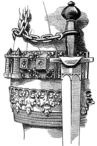 Рыцарский пояс и меч XIV в. Реконструкция XIX в. Такой массивный, богато украшенный рыцарский пояс (особый интерес вызывают поясные накладки в форме рыцарского замка) мог себе позволить в то время только очень состоятельный рыцарь. Одноручный меч имеет предохранительную цепь (если даже меч выбивали из рук рыцаря, он его не терял), один конец которой прикреплен к кольцу, надетому на рукоять меча, а второй – к нагруднику доспеха (начиная с конца XIII в. рыцарский шлем, меч и кинжал имели такую цепь, которая крепилась к поясу сюркота, но после 1300 г. их стали прикреплять заклепками или скобами к нагруднику доспеха)