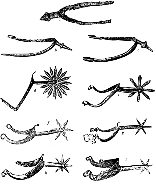 Эволюция рыцарских шпор с XII по XV в. (a). Железная шпора, XII в. (b, c). Железные шпоры, XIII в. (d). Железная шпора с бронзовым колесиком, 1350 г. (e). Бронзовая шпора, 1370 г. (f). Медная шпора, покрытая позолотой, 1400 г. (g). Медная шпора, частично покрытая позолотой, 1400 г. (h). Бронзовая шпора, XV в. (i). Стальная шпора, конец XV в.