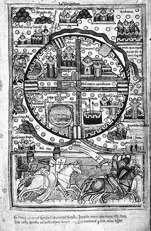 План Иерусалима и его окрестностей. Этот план датируется примерно 1170 годом. До наших дней сохранилось много планов и схем святого города. Такое обилие планов свидетельствует о том, какое важное место отводилось святым местам в западной религиозной системе. Обратите особое внимание на низ плана. Там показана рыцарская конница крестоносцев, которая преследует бегущую конницу мусульман.