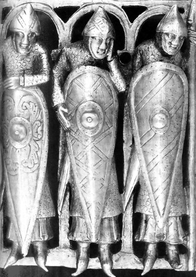 Тяжеловооруженные западноевропейские воины. Фрагмент барельефа, украшающего храмовую дароносицу, Европа, середина XII века. Воины показаны в типичном для XII века боевом снаряжении. У многих крестоносцев того времени было такое же защитное снаряжение.